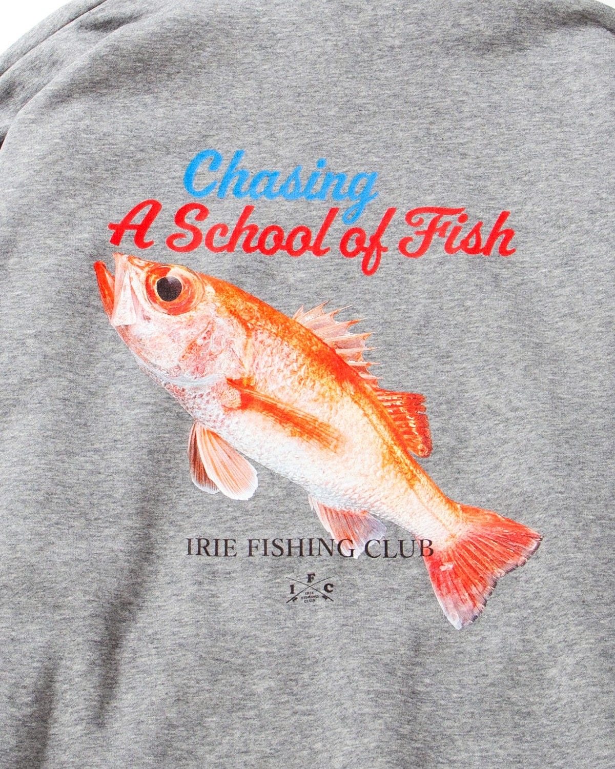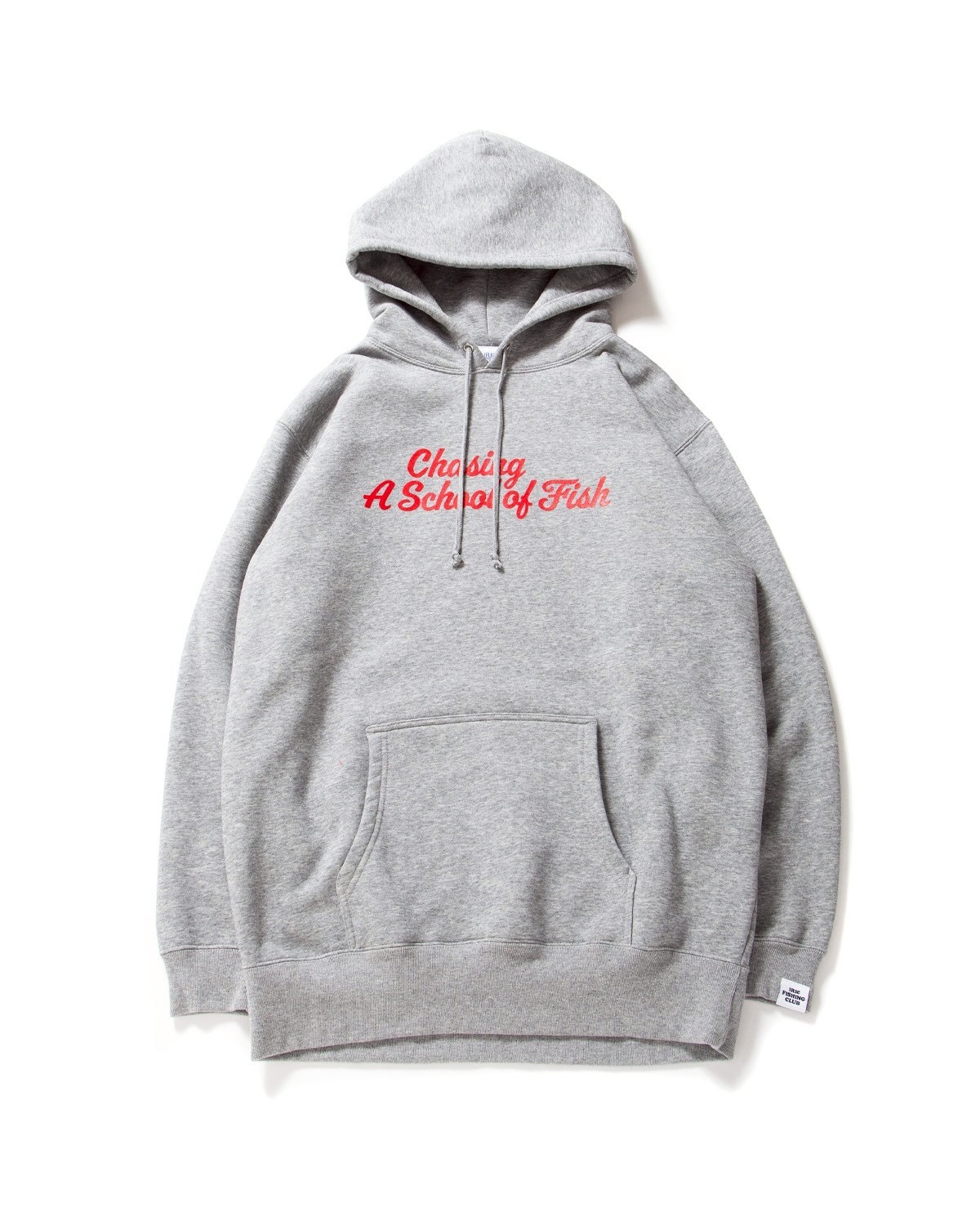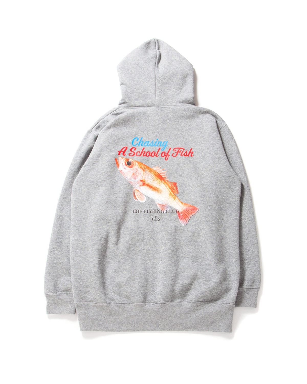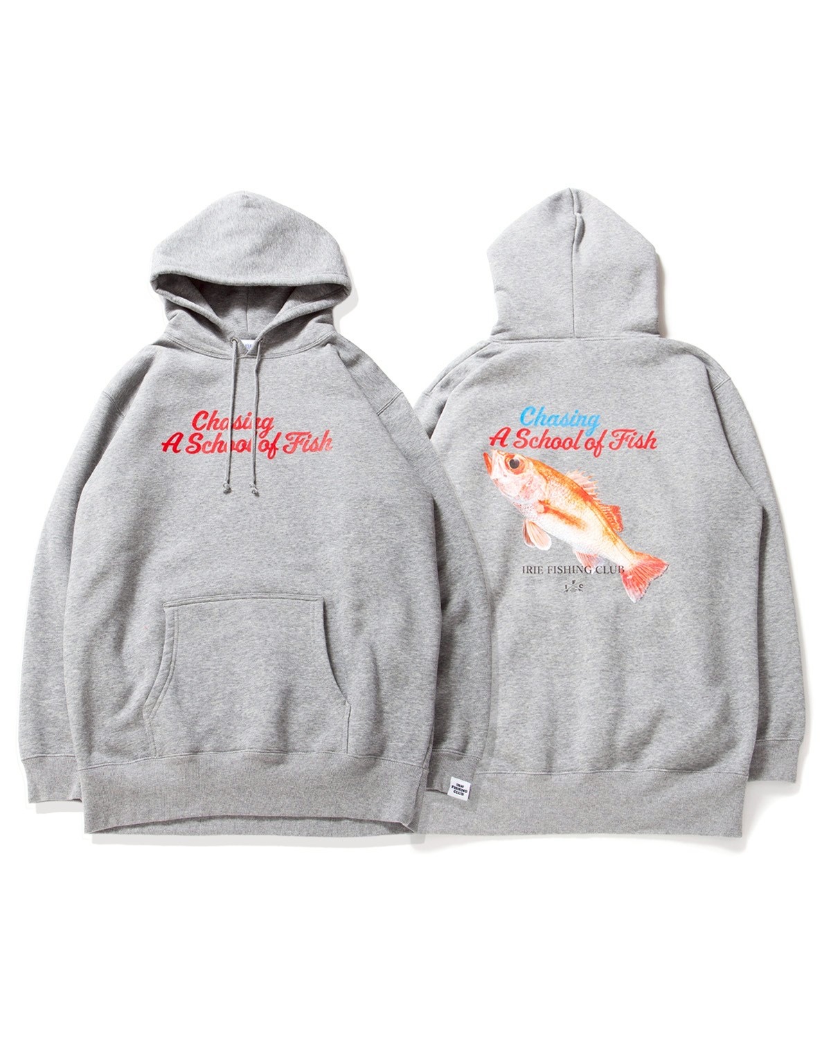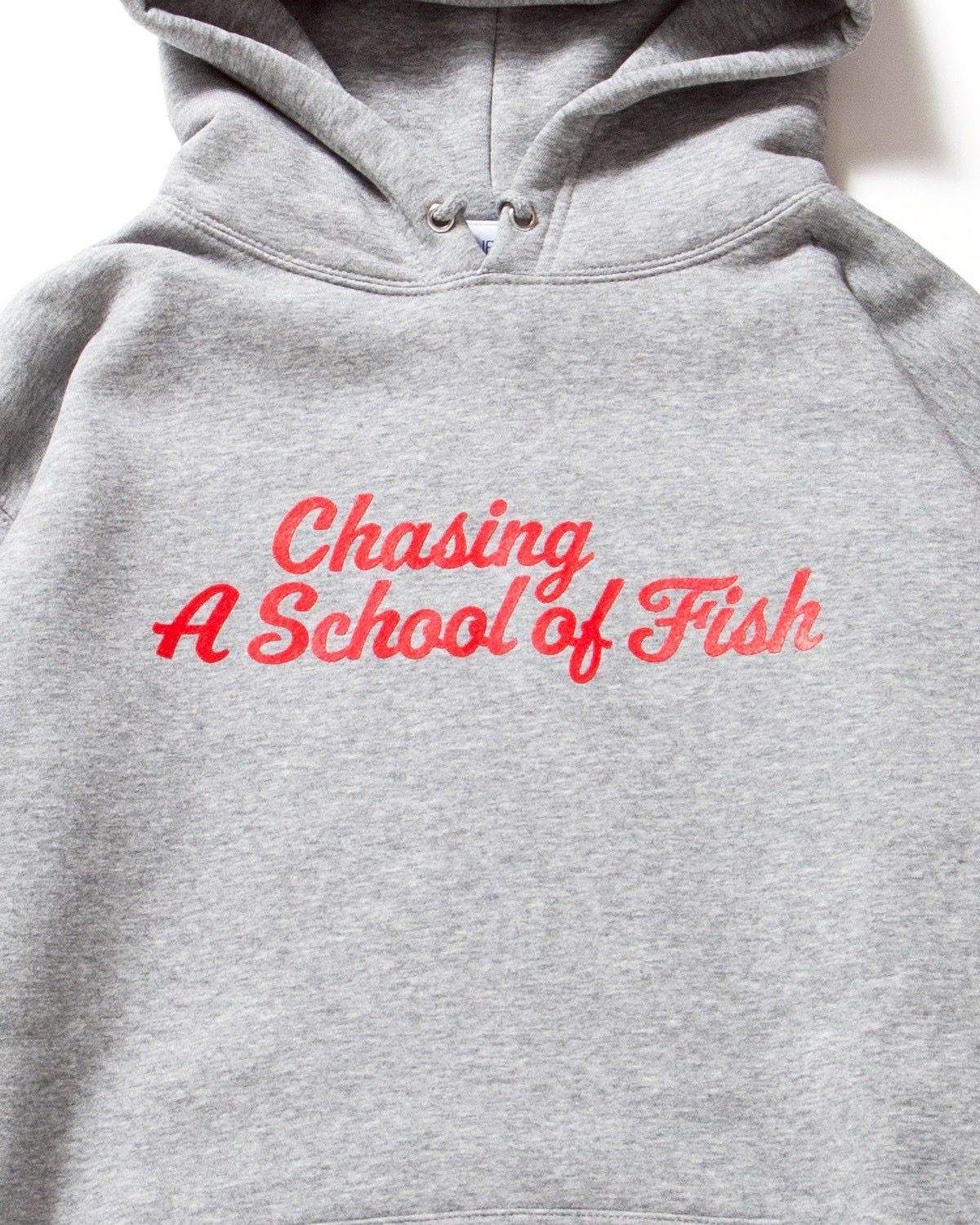 深海の宝石と呼ばれる高級魚「あかむつ(ノドグロ)」を大胆に落とし込んだ「CHASE A SCHOOL OF FISH HOODIE」。